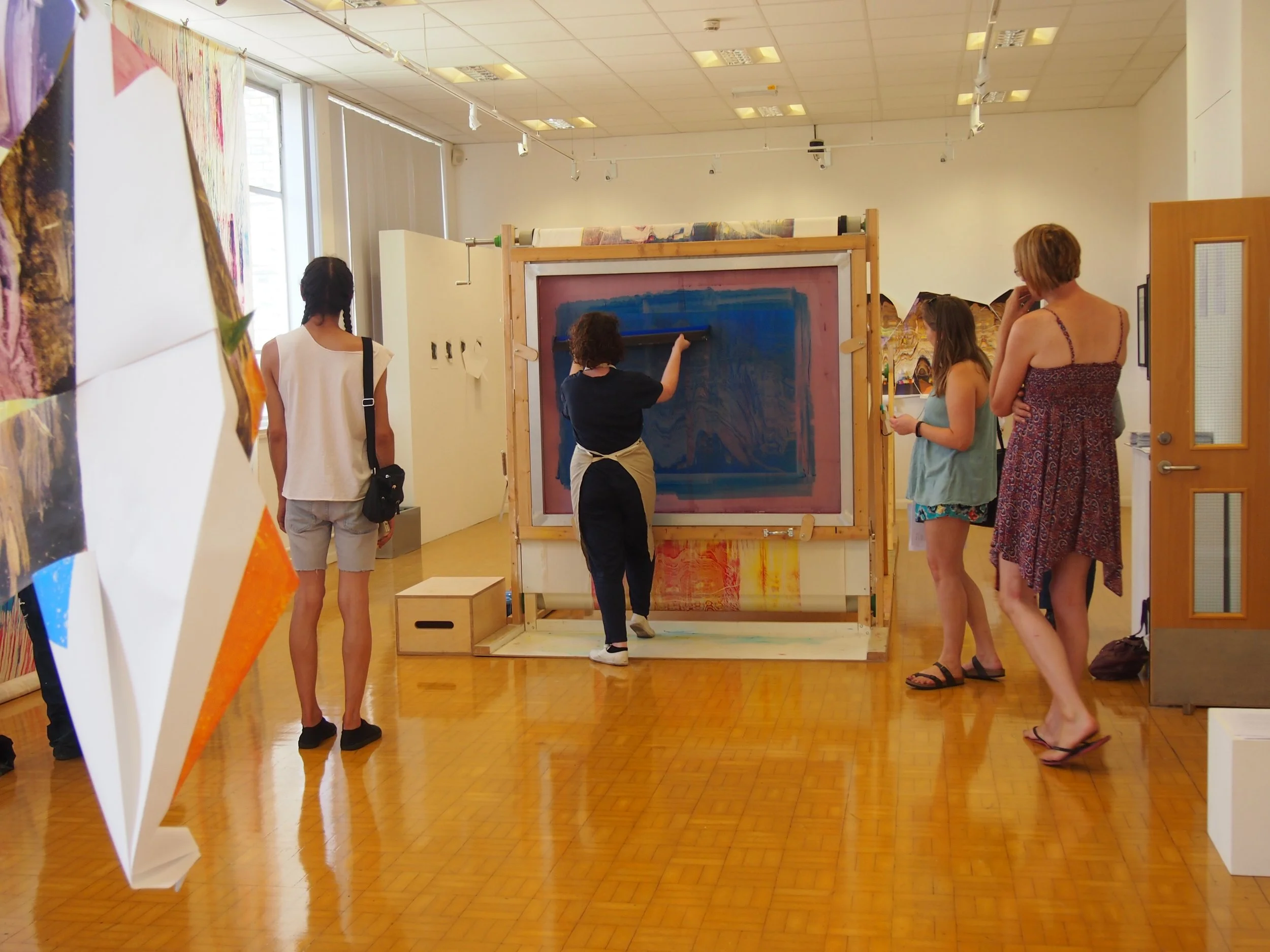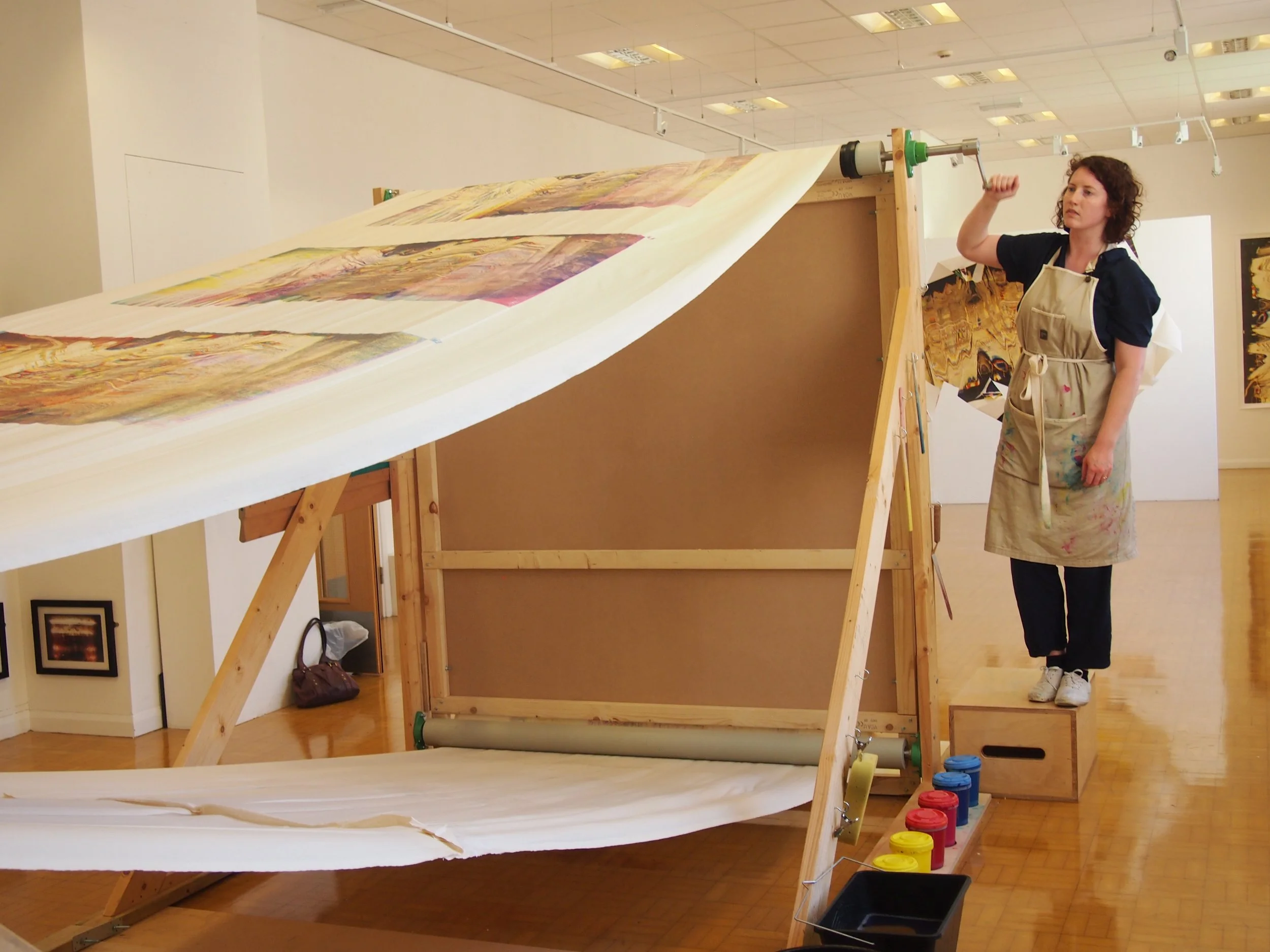 Elizabeth Tomos & Charlotte Richards (2018) “Reflections & Refractions” [Screenprint on calico, stretched onto a wooden frame]. Approx. 109cm (h) x 81cm (w), slight variation in size.
